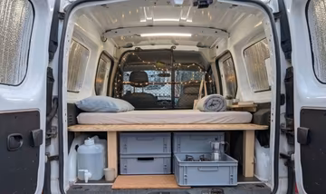 - Gemütlich machen: Matratze ausklappen ("Sleep"), Lichterkette per Karabiner ans vorhandene Trenngitter hängen, Fenster verdunkeln – fertig ist der Camper!